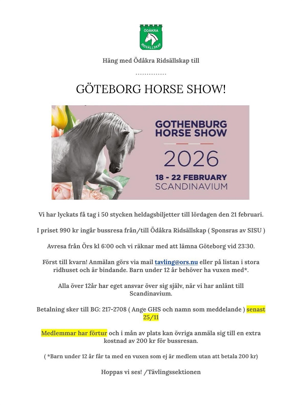 Sista dagen att anmäla och betala är idag så missa inte din chans att hänga med ÖRS till Göteborg Horse Show!